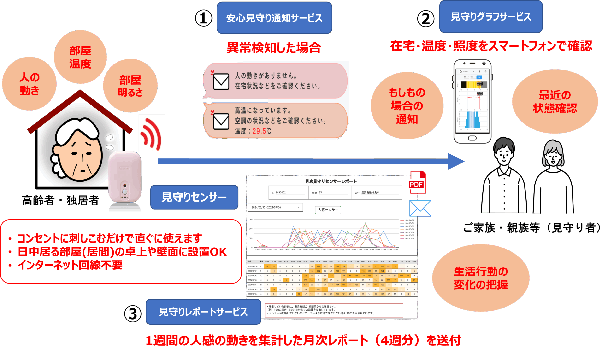 また、1週間単位のセンサー情報の統計値を1ヶ月単位に見守りレポートとして、ご家族・親族等にお送りいたします。